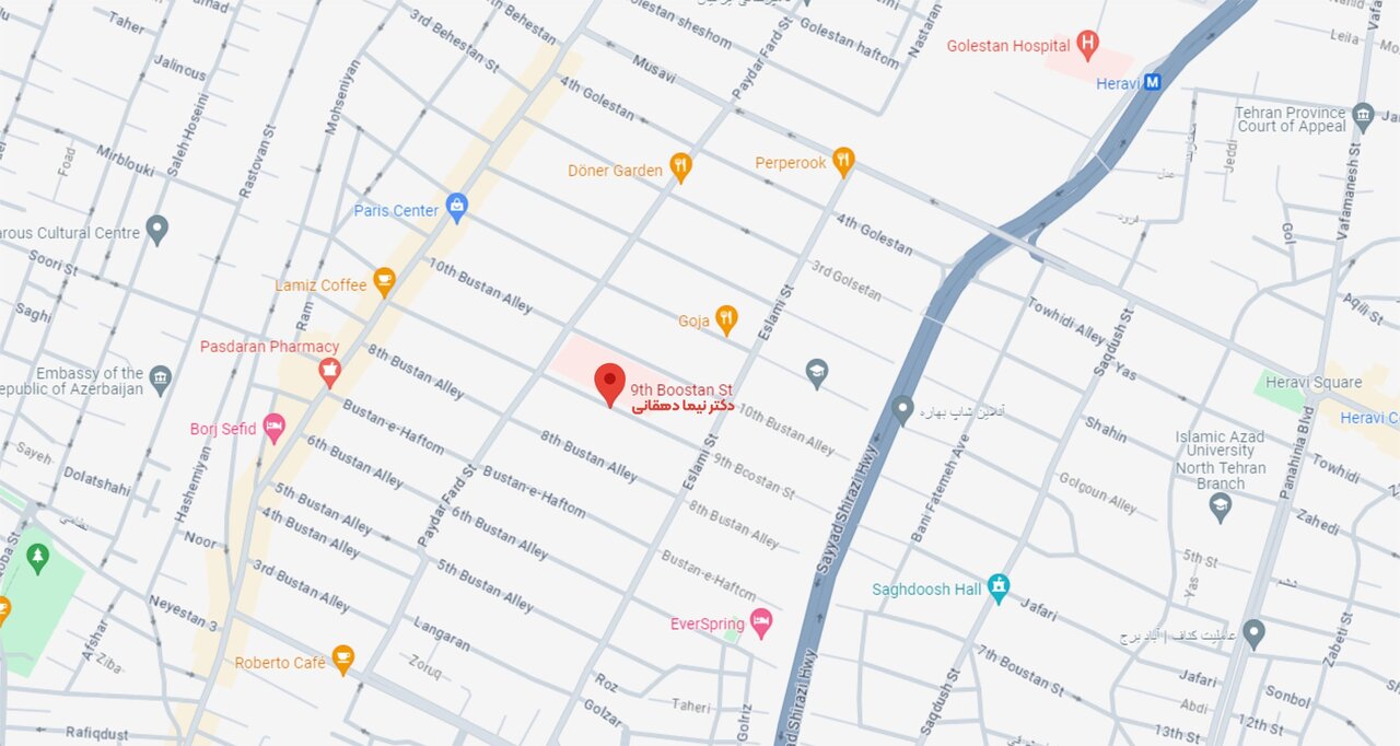 آدرس مطب: خیابان پاسداران، خیابان بوستان نهم (شهید جعفری) ساختمان مهرگان، پلاک ۱۲۱،طبقه همکف،واحد ۴